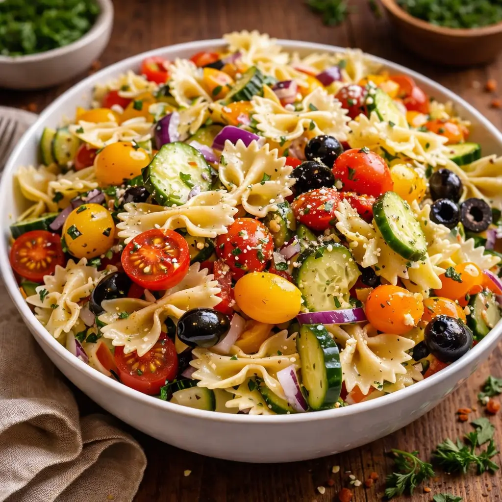 A fresh and colorful California pasta salad packed with crisp vegetables and tossed in a zesty Italian dressing—perfect for barbecues, picnics, and gatherings.