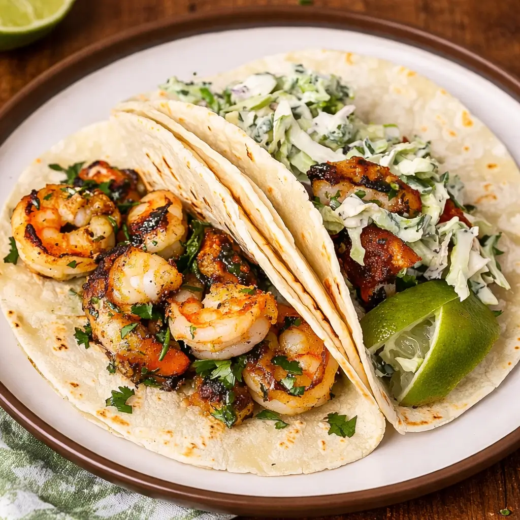 Juicy cilantro lime shrimp tucked into warm tortillas and topped with a creamy crunchy slaw. Finished with avocado and a touch of honey-lime sauce, these quick tacos are bright, flavorful, and perfect for busy weeknights or casual gatherings.