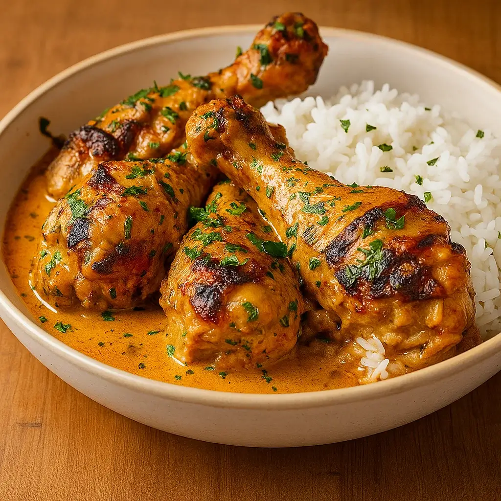 Tender roasted chicken drumsticks smothered in a smoky, creamy paprika sauce, served over fluffy white rice. This comforting dish combines rich flavors with a satisfying, hearty texture—perfect for a gourmet-style dinner at home.
