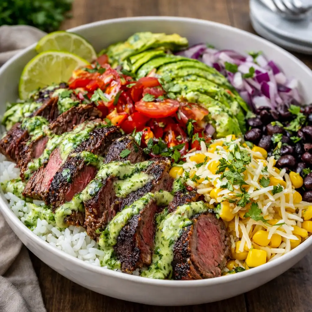 Tender marinated steak with a perfect char served over cilantro lime rice and topped with fresh, colorful ingredients for a restaurant-quality bowl at home.