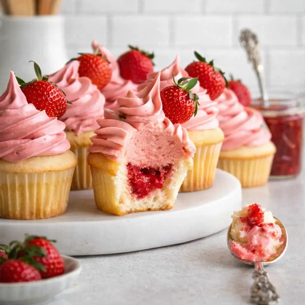 Soft white cupcakes filled with homemade strawberry jam and topped with fluffy strawberry cream cheese frosting—perfectly sweet and fruity.