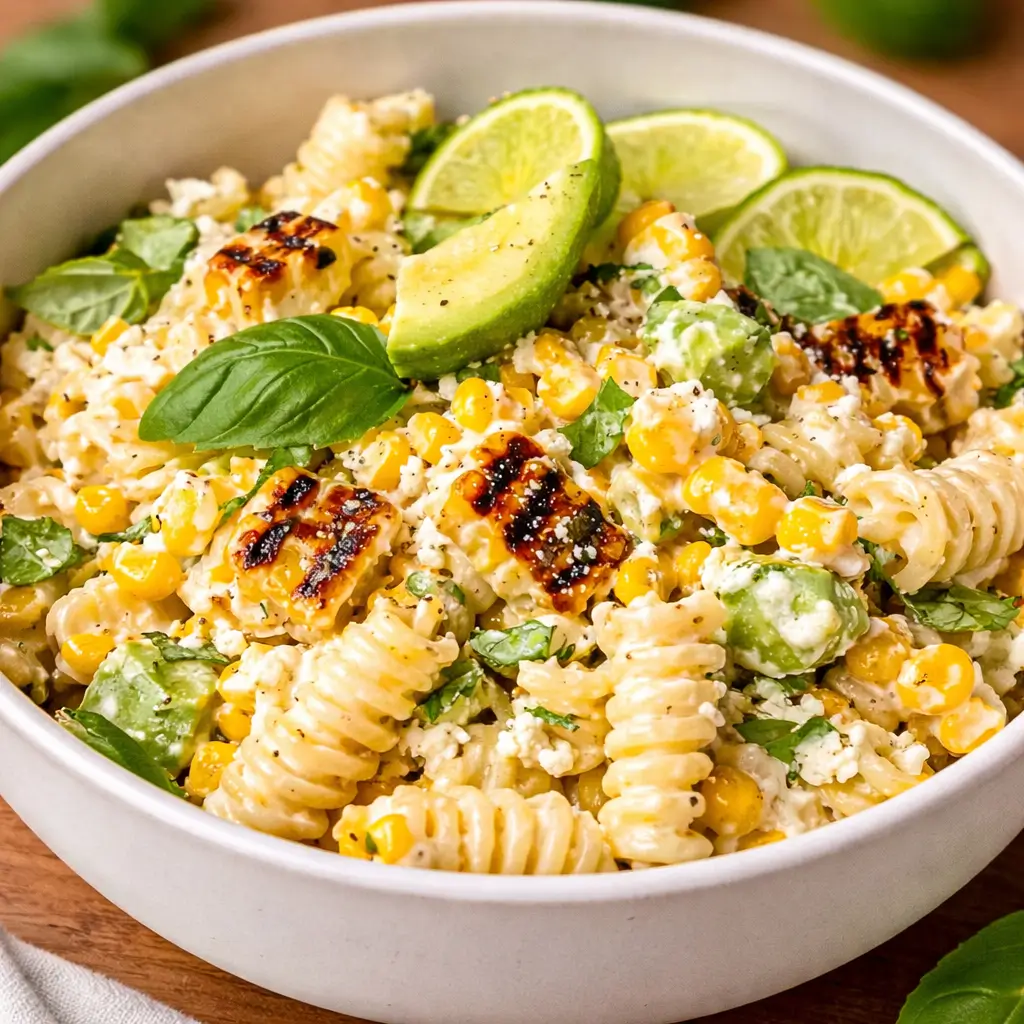 A vibrant and flavorful street corn–inspired pasta salad tossed in a creamy cotija dressing, topped with smoky chili butter and zesty lime mayo for the perfect balance of heat and freshness.