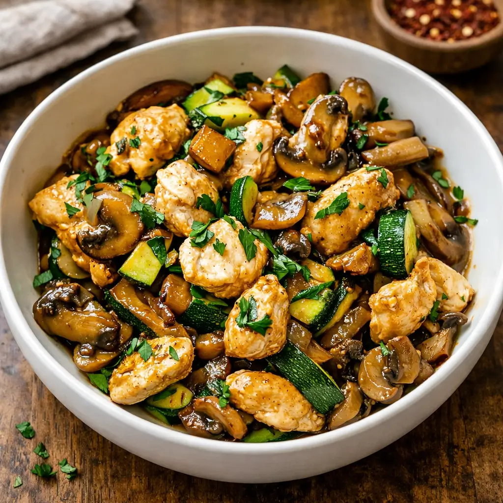 A quick, healthy stir-fry with juicy chicken, tender zucchini, mushrooms, and a savory-sweet sauce — perfect for easy weeknight dinners.