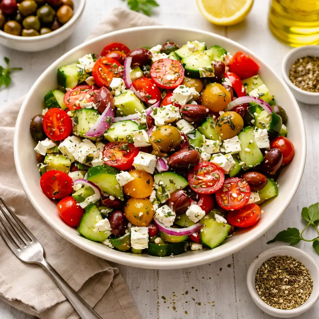 A crisp and bright Greek salad featuring crunchy vegetables, briny olives, and creamy feta, perfect for summer meals, potlucks, or a quick healthy lunch.