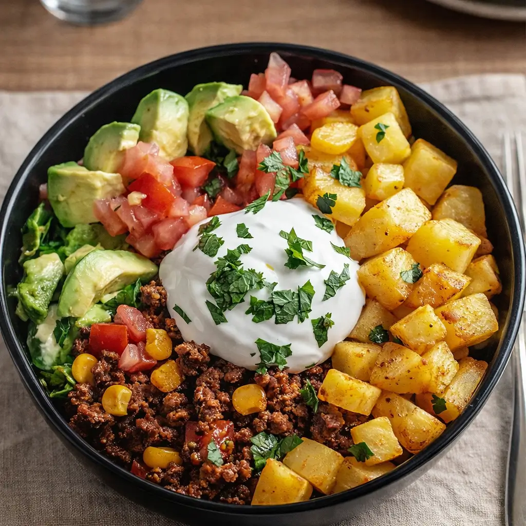 Experience the delightful blend of seasoned ground beef, tender potatoes, and vibrant toppings in this satisfying taco bowl that brings together flavor and fun.