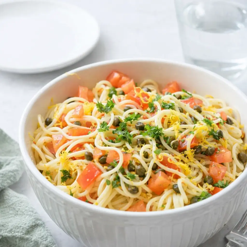 This cool and refreshing pasta salad is filled with capers and tomatoes in a light lemon dressing.