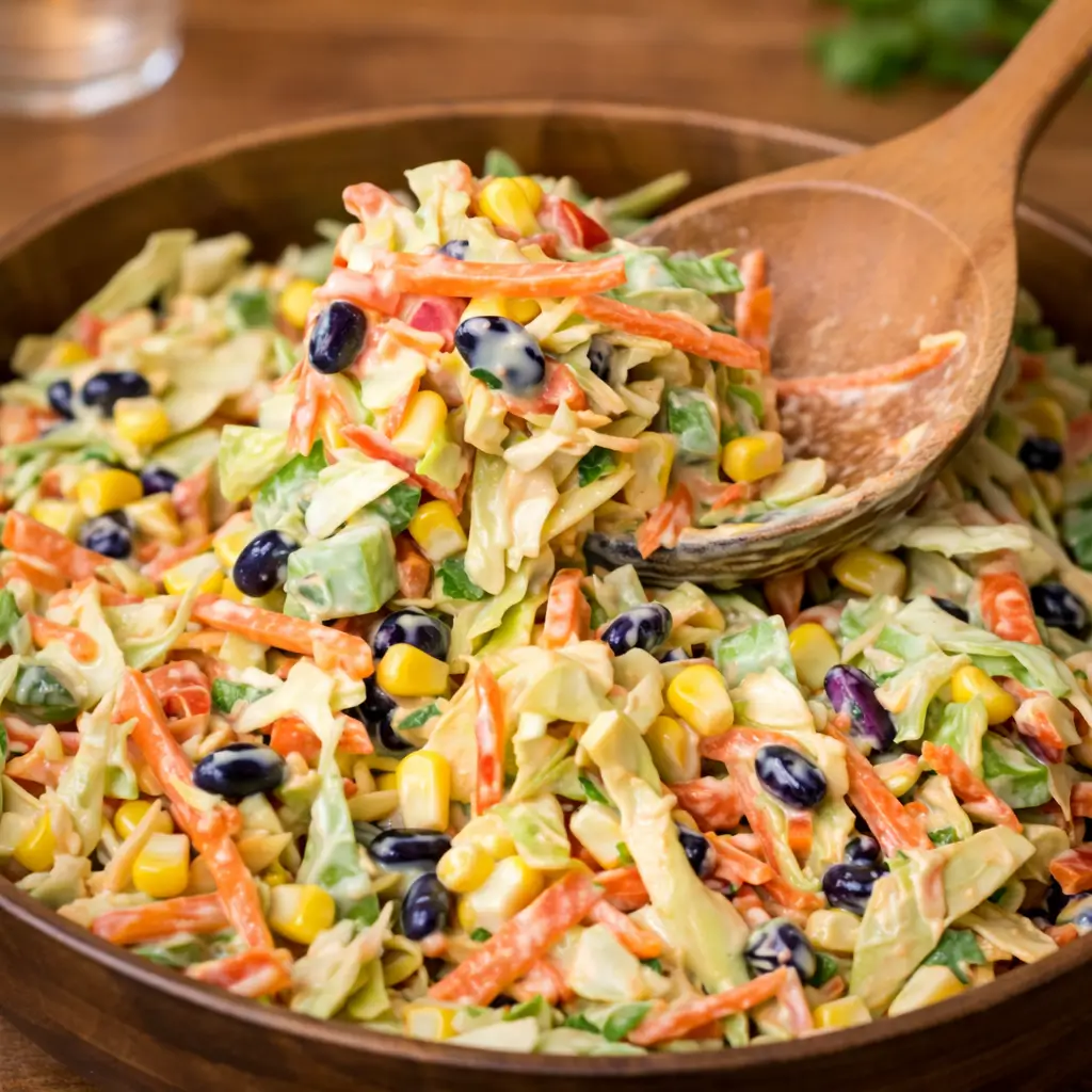 A vibrant Mexican-inspired coleslaw made with crisp cabbage mix, sweet corn, hearty black beans, colorful bell peppers, and a creamy lime taco dressing for the perfect zesty crunch.