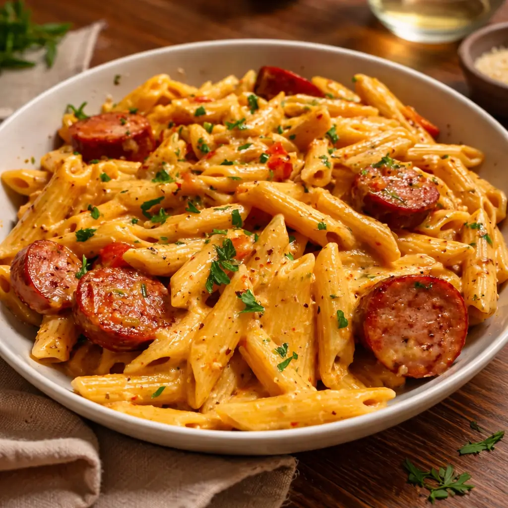 This one-pot creamy spicy Cajun sausage pasta is a rich and comforting dish packed with smoky sausage, tender pasta, and bold Cajun flavors—all made in a single pot for an easy, satisfying meal.