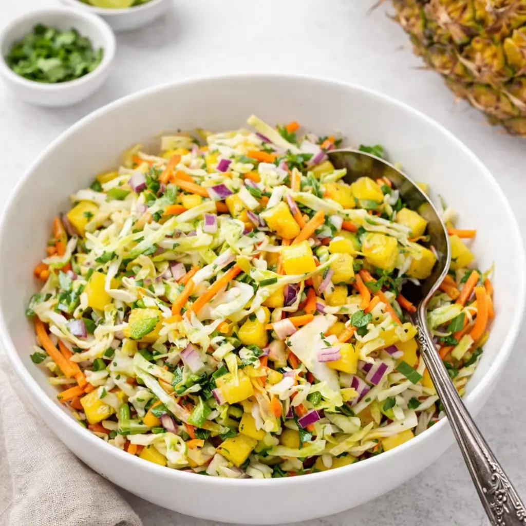 A refreshing and vibrant pineapple coleslaw made with crisp cabbage, sweet juicy pineapple, and spicy jalapeños tossed in a tangy lime vinaigrette. Perfect for tacos, burgers, and BBQs.