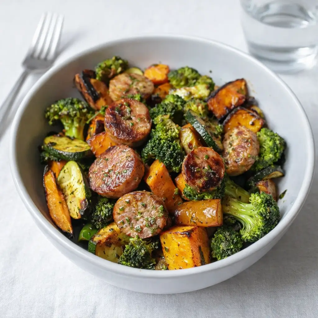 A delightful one-pan meal that’s not only delicious but also incredibly easy to prepare, combining chicken sausage with sweet potatoes, zucchini, and broccoli.