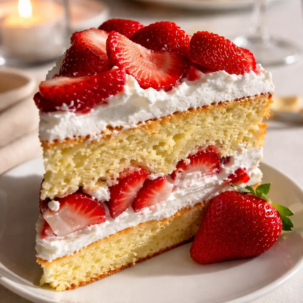 A delicious and classic strawberry shortcake cake with layers of fluffy sponge cake, fresh strawberries, and whipped cream.