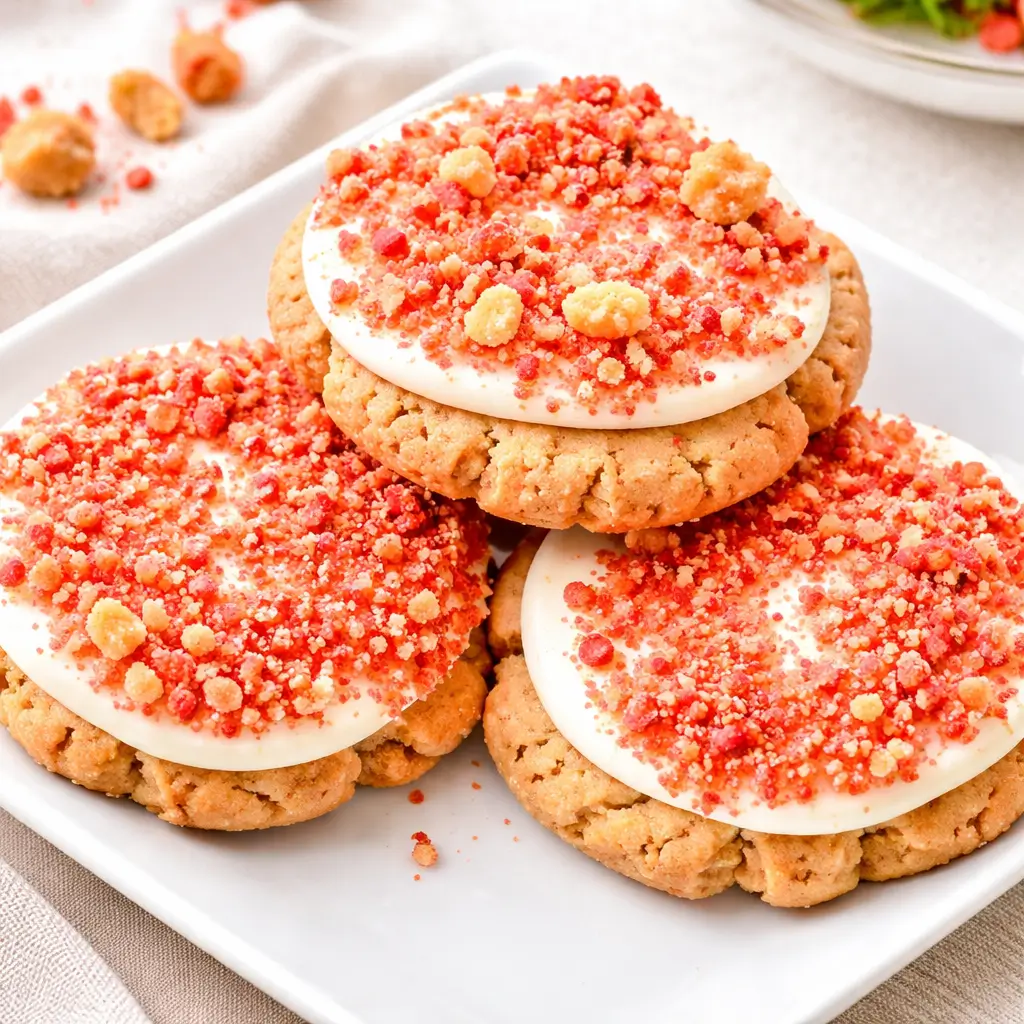 Store your Strawberry Shortcake Cookies in an airtight container in the fridge for up to 5 days. If you prefer them soft and fresh, let them sit at room temperature for 10 minutes before eating. They can also be frozen (frosted or unfrosted) for up to 2 months — just wrap them tightly. When ready to enjoy, thaw in the fridge overnight or on the counter for an hour. The crunch topping will stay crisp if you keep it sealed in a separate airtight jar and sprinkle fresh before serving.