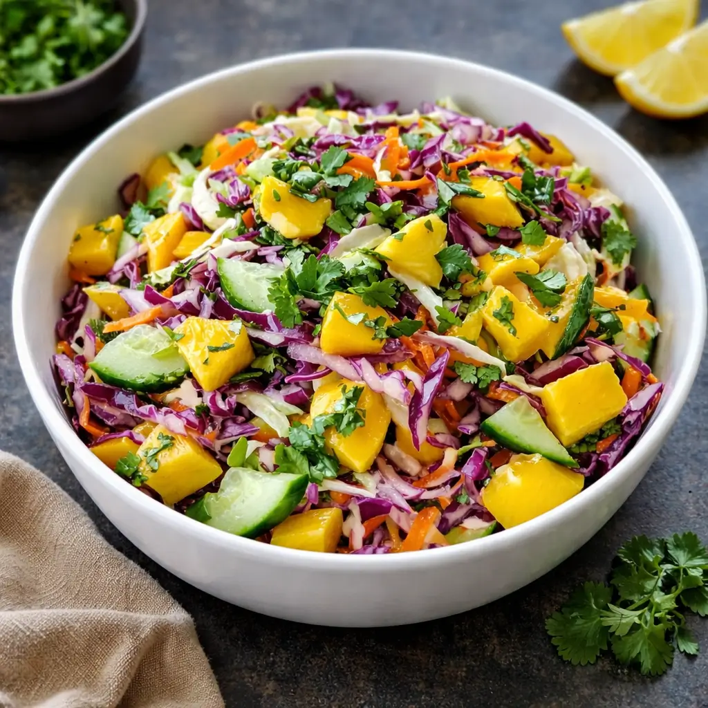 A bright and refreshing slaw made with crisp cucumber, sweet mango, and colorful vegetables tossed in a zesty chili-lime dressing. Perfect as a light summer side dish or taco topping.
